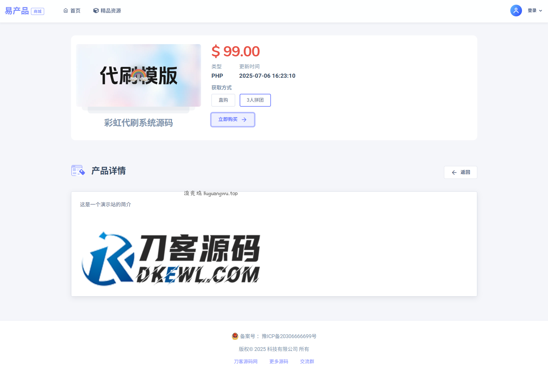 最新团购源码商城 虚拟商城系统源码 全开源 2025-07-08 网站源码 124 文章目录[隐藏] 简介: 图片: 注册本站资源,关注公众号,送本站最低一年vip,最高可得终生vip,所有资源免费下载!!!!!! 简介: 最新团购源码商城 虚拟商城系统源码 全开源 基于PHP开发的多功能在线商城系统,适合个人、小型企业或创业团队快速搭建自己的商品销售平台。系统界面美观,功能丰富,支持多种支付方式和灵活的商品管理,助力商家高效开展线上业务 图片: 此内容仅限注册用户查看,请先登录 注册本站资源,关注公众号,送本站最低一年vip,最高可得终生vip,所有资源免费下载!!!!!! 0